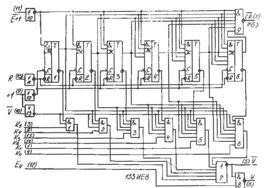 Нашел распространение также способ, при котором коэффициент пересчета счетчика, составляющего основу делителя, не меняется, а производится выбор дешифраторов, настроенных на выделение различных состояний счетчика. Данный способ построения делителей иллюстрируется на примере ИС 133ИЕ8 (рис. 7).