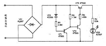 При свободной линии постоянное напряжение в ней около 60 В. Стабилитрон VD2 "пробивается" (открывается), и в базу транзистора VT1 подается через ограничительный резистор R1 управляющий ток. Открытый и насыщенный транзистор VT1 шунтирует вход каскада на транзисторе VT2, поэтому усилитель тока закрыт и светодиод VD3 погашен. При подключении в линию посторонних устройств напряжение в линии падает и ток, протекающий через стабилитрон VD2, уменьшается (вплоть до закрытия последнего). Транзистор VT1 закрывается, а в базу транзистора VT2 через резистор R2 подается управляющий ток. Усилитель открывается и светодиод VD3 включается.