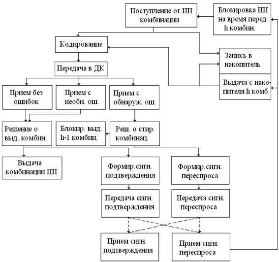 в это время в канал через кодер передаются хранящиеся в накопителе последние h комбинаций. После их передачи ИС опять получает разрешение на передачу очередных комбинаций. Таким образом, последовательность передаваемых и принимаемых комбинаций не нарушается.