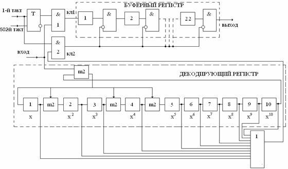 Деление осуществляется многотактным фильтром с числом ячеек, равным числу проверочных разрядов (степени порождающего полинома). В рассматриваемом случае число ячеек r=10. Число сумматоров в устройстве равно числу ненулевых членов g(х) минус единица. В данном случае число сумматоров равно четырем. Сумматоры устанавливаются после ячеек, соответствующих ненулевым членам g(х). Поскольку все неприводимые полиномы имеют член х°=1, то соответствующий этому члену сумматор установлен перед ключом 3 (логической схемой И).