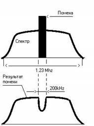 CDMA называют широкополосной системой и сигналы идущие в эфире шумоподобными. Широкополосная – потому, что занимает широкую полосу частот. Шумоподобные сигналы – потому, что когда в эфире на одной частоте, в одно и то же время работают несколько абонентов, сигналы накладываются друг на друга (можно представить шум в ресторане, когда все одновременно говорят). Помехоустойчивая – потому, что при возникновении в широкой полосе частот (1,23 МГц) сигнала-помехи, узкого диапазона (<150 кГц), сигнал примется почти неискаженный. За счет помехоустойчивого кодирования потерянные данные система восстановит. На рисунке 1.2 показан полезный сигнал и помеха (СЗС – селективная помеха) [4].