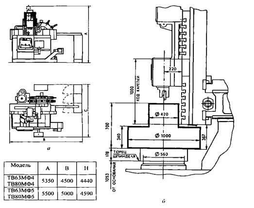 Отличие станков ТВ63МФ5 (ТВ80МФ5) от ТВ63МФ4 (ТВ80МФ4) в том, что их столы имеют возможность смещения от исходного положения на длину хода +400 мм, - 200 мм (при диаметре изделия 1000 мм) и +470 мм, - 400 мм (при диаметре изделия 800 мм и менее).