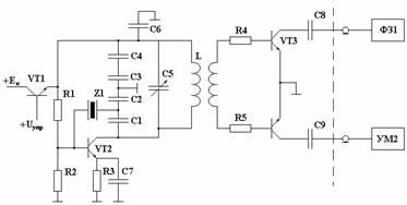 Управляемый кварц ЗГ выполнен на транзисторе VT2, в коллекторную цепь которого включен колебательный контур, образованный катушкой L и емкостью делителя.