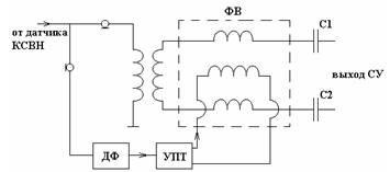 В качестве датчика рассматриваемой схемы САР может использоваться датчик фазы входного сопротивления согласующей цепи, установленный на выходе сумматора мощности. Сигнал рассогласования с фазового датчика поступает на усилитель постоянного тока, выход которого подключен к управляющей обмотке ферровариометра (ФВ), обеспечивая в ней необходимое подмагничивающее поле и соответствующее изменение компенсирующей индуктивности СУ. Такое изменение происходит до тех пор, пока реактивная составляющая не станет равной нулю, Im
