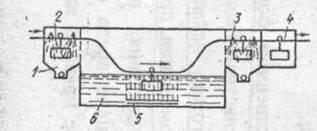 Промывку с помощью ультразвука проводят в специальных ваннах (рис. 1). Ванна 6 заполняется растворами щелочей, кислот или органическими растворителями. В растворы щелочей на 1 л воды входят следующие компоненты в г; сода кальцинированная - 20; тринатринфосфат - 10, силикат натрия - 20, едкий натрий - 5-25 и др. В растворы кислот; на 1 л входят: серная кислота - 100 мл, соляная кислота - 50 мл, хлористый натрий - 60 г, азотная кислота - 100 мл, фтористый калий или кальций - 5-10 г и др.