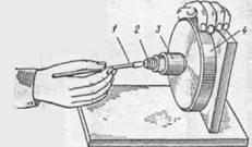 Маховик 4 вращается от руки сборщика. В результате вращения оптической детали 2, закрепленной в цанговой оправе 3, ускоряется процесс чистки поверхности, так как вместо хаотических движений руки достаточно провести кисточкой 1 или ватным тампоном в горизонтальном направлении от центра вращения детали к краю, и она становится чистой. Коническая резьба на наружной поверхности цанговой оправы и внутренней поверхности резьбового кольца позволяет плавно и с нужным усилием зажимать очищаемые детали и узлы. В некоторых случаях вместо волчка применяют электродвигатель. Процесс чистки совмещают со сборкой узлов и приборов. Например, при сборке окуляров, объективов и других узлов, после выполнения переходов подрезки оправ, центрирования и завальцовки линз проводят промывку механических и чистку оптических деталей.