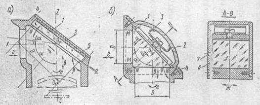 Зеркала кладутся на опорные плоскости R корпуса и прижимаются к ним крышкой 3 - посредством четырех или трех винтов4 либо плоской пружиной А (рис 6, б).