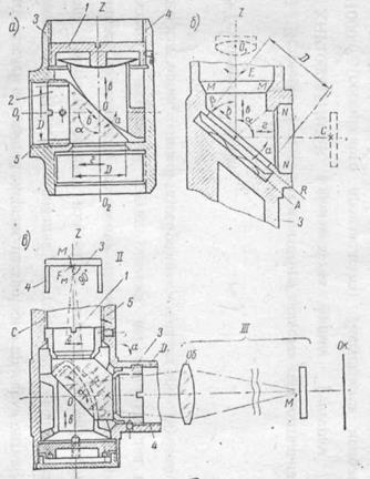 Наиболее просто собираются неподвижные зеркала и призмы наблюдательных труб (рис. 5 а и б), установленные перед объективом в параллельных пучках лучей.