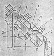 Юстировку наклона изображения в приборах с большим числом зеркал или призм, используемых в лабораторных условиях, удобно производить зеркалом 1 или призмой 2 (рис. 6), которые могут менять наклон отражающей грани. Это достигается поворотом оправы 3 призмы при помощи трех винтов 4, наклоняющих винт 5 с шаровой головкой па нужный угол е относительно неподвижной крышки б корпуса призмы. Величина наклона ограничивается величиной зазора между винтом 5 и отверстием в крышке 6.