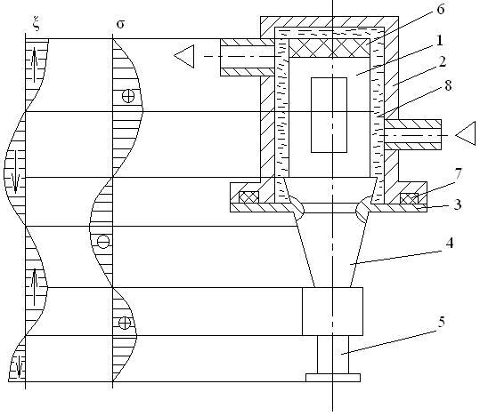 1 - преобразователь; 2 - корпус; 3 - опора; 4 - концентратор; 5 - инструмент; 6 - звукопоглащатель; 7. - уплотнение; 8. - охлаждающая жидкость.