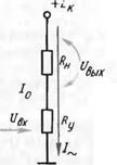 Каскады усиления состоят из последовательно включенных управляемого элемента, параметры которого изменяются в зависимости от поступающего на его вход напряжения или тока, и резистора нагрузки . В показанной на рис. 3 эквивалентной схеме управляемый элемент (лампа или транзистор) заменен резистором , сопротивление которого зависит от напряжения входного сигнала .