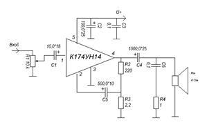Микросхема К174УН14(TDA2003) предназначена для работы при напряжении источника питания 8-18 В и сопротивлении нагрузки не менее 2 Ом. При этом достигается равномерное усиление сигнала в полосе частот 30 Гц - 20 кГц, а ток покоя составляет 40-60 мА. Чувствительность усилителя - около 50 мВ. Микросхема снабжена собственным теплоотводом, допускающим работу с выходной мощностью не более 2 Вт. Для получения большей мощности обязательно требуется установка дополнительного пластинчатого либо ребристого или игольчатого радиатора.Коэффициент усиления во всей полосе воспроизводимых частот стабилизирован за счет наличия на выходе усилителя делителя напряжения сигнала 1:100 и подачей с него напряжения отрицательной обратной связи на инверсный вход усилителя.