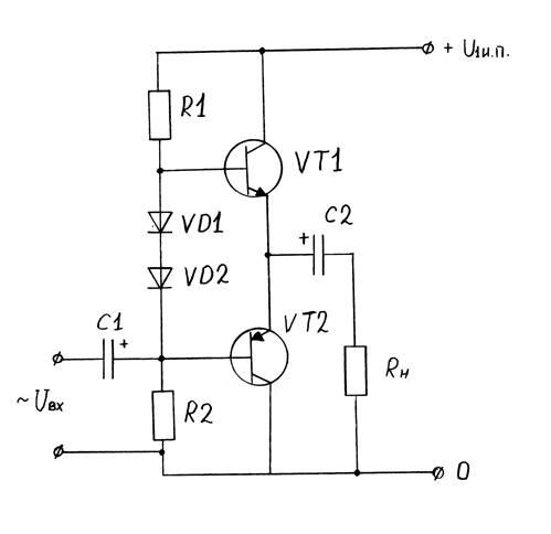 Данный усилитель построен с применением в качестве предъварительного усилителя-фильтра схемы фильтра НЧ Батерворта второго порядка. В качестве выходного каскада был применен двухтактный каскад на комплиментарных транзисторах, работающих в режиме А-В.
