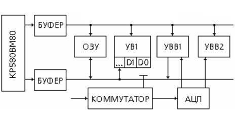 КР580ВМ80 — микропроцессор, способный выполнять функции центрального процессора ЭВМ, т.е. может считывать информацию из внешних устройств, памяти и производить над ней арифметические и логические операции, анализировать результаты вычислений и записывать данные в память и внешние устройства, функционируя при этом под управлением команд из некоторого фиксированного множества, в нашем случае памяти программ, т.е. ПЗУ. Обмен с внешними устройствами и памятью микропроцессор осуществляет через восьмиразрядную шину данных. Микропроцессор КР580ВМ80 обращается к памяти и внешним устройствам через 16-разрядную шину адреса.