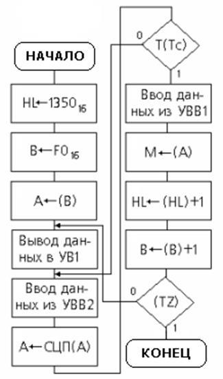 При опросе каждого датчика содержимое регистра В увеличивается на 1. При опросе последнего датчика в регистре записывается число FF = 11111111. Добавление следующей 1 обнуляет регистр В. На выходе триггера нуля TZ появляется 1. Номер ячейки ОЗУ, в которую должен быть записан результат опроса датчика, содержится в паре РОН, например, в регистрах HL.