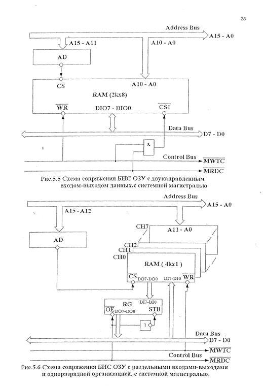 Раздельные входы-выходы данных требуют установки дополнительного буферного регистра, например КР580ИР82, разрешающего конфликтную ситуацию на шине данных. Как и ранее, адресный дешифратор выбирает блок ОЗУ ёмкостью 2кВ. На цикле чтения выбирается выходной буфер регистра. Благодаря инвертору формируется строб STB, что в свою очередь передаёт байт данных из выбранной ячейки через регистр на шину данных. При записи регистр заблокирован, а передаваемый байт из шины данных зафиксируется сигналом MWTC в выбранной ячейке. Организация интерфейса БИС ПЗУ с системной магистралью аналогично. Наиболее трудной задачей является проблема расчёта