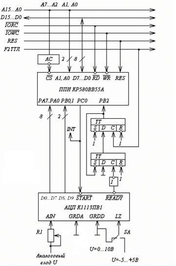 КР580ВВ55 – программируемый параллельный адаптер, который предназначен для управления внешними устройствами. Данная БИС адресуется с помощью дешифратора, реализованного на микросхеме К155ИД7. Адаптер имеет три порта ввода/вывода (А, В и С), которые могут быть настроены в различных направлениях. Настройка адаптера происходит с помощью следующих сигналов: A1, A0, CSPPI, IORC, IOWC, RESET.