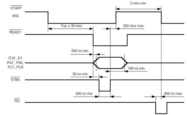 Рассмотрим алгоритм работы микросистемы. Пусть первая занятая ячейка ОЗУ имеет номер 1350h. В нее будет помещен результат опроса 1-го датчика с номером 000. Через аккумулятор и шину данных номер датчика подается на устройство вывода 1 (УВ1). УВ1 подает номер датчика на коммутатор. Коммутатор опрашивает нужный датчик и передает аналоговый сигнал на АЦП. АЦП преобразует аналог. сигнал в цифровой и передает цифровой сигнал на УВВ1. Если в первом такте импульсной последовательности Ф1 МП передает номер датчика, то во втором такте он ожидает прихода сигнала окончания преобразования от АЦП. Сигнал окончания равный 1 передается через УВВ2, через шину данных в аккумулятор. Наличие сигнала окончания аккумулятор проверяет операцией циклического сдвига вправо. Если сигнал окончания пришел, то при сдвиге вправо 1 из младшего разряда аккумулятора передается в триггер сдвига ТС, триггер сдвига устанавливается в состояние 1, и данные из устройства ввода 1 по шине данных передаются в аккумулятор, а из него в ячейку ОЗУ. Содержимое пары регистров HL и регистра В увеличивается. на 1, при этом формируется номер следующего датчика и номер ячейки, куда должен быть помещен следующий результат.