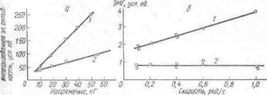 Рисунок 1 – Зависимость амплитуды интегрированной ЭМГ; а — от усилия, развиваемого мышцей, при двух (1, 2) различных постоянные скоростях укорочения икроножной мышцы человека; б — от различных скоростей укорочения и удлинения (2) мышцы.