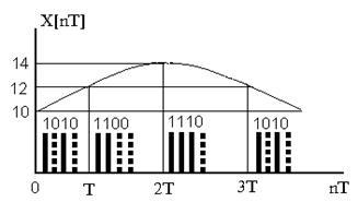 На рис. 2 приведен пример, иллюстрирующий процесс передачи дискретных сообщений с использованием кодоимпульсной модуляции.