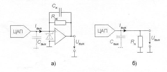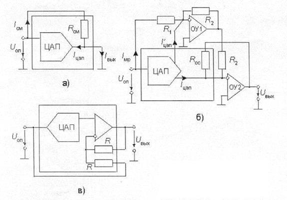 На рис.8,а наведена схема з перетворювачем струму в напругу на операційому підсилювачі. Ця схема придатна для усіх ЦАП зі струмовим виходом. Оскільки плівкові резистори, що визначають вагові струми ЦАП мають значний температурний коефіцієнт опору, резистор зворотнього зв’язку треба виготовляти на кристалі ЦАП та в тому ж технологічному процесі, що звичайно і робиться. Це дозволить знизити температурну нестабільність перетворювача у 300...400 разів. Вихідна напруга схеми на рис.8,а