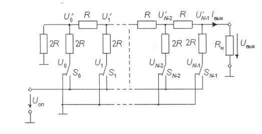 Таким же чином виконується перетворення для інших розрядів слова. В результаті для N-розрядного ЦАП вихідна напруга буде дорівнювати