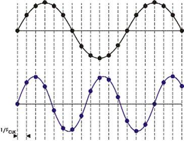 Вихідний синусоїдальний сигнал відновлюється з окремих відліків. Ціле число відліків на період укладається лише в окремому випадку В більшості випадків це не так, і на кожному новому періоді сигналу відліки знаходяться в нових місцях. Звичайно, картина періодично повторюється, але період повторення може бути самим різним.