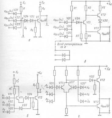 Рисунок 7. а- сочетание диодного логического элемента И с транзисторным инвертором. На этом же рисунке различные модификации