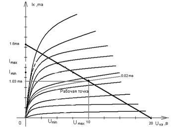 По этим данным выбираем транзисторы выходного каскада. По характеристикам находим напряжение и ток базы транзисторов в рабочей точке, их амплитудные значения.