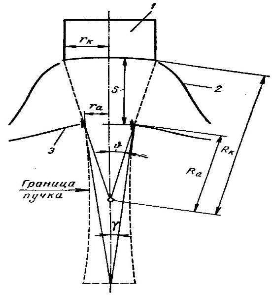 Первая составляющая, отражающая воздействие на электрон электрического поля, используется для ускорения электронов и формирования электронного луча. Сила, действующая на электрон в электрическом поле, направлена вдоль силовых линий поля и перемещает электрон в сторону положительного полюса. Вторая составляющая силы, действующая только на движущийся электрон, всегда направлена перпендикулярно как к направлению его скорости, так и к силовым линиям магнитного поля. Она не может изменить величину энергии электрона, а лишь меняет направление его движения. Магнитные поля, создаваемые на пути электрона, применяются для фокусировки пучка, компенсации расталкивающего действия пространственного заряда в луче и для изменения направления электронного луча. На рисунке 3.8 показана схема излучателя электронов типичной конструкции аксиального излучателя со сходящимся пучком, состоящего из катода 1, фокусирующего катодного электрода 2, находящегося также под потенциалом катода, и анода 3 с отверстием для вывода пучка в рабочую камеру. Для формирования сходящегося осесимметричного пучка катод и анод должны быть частями концентрических сфер, а фокусирующий электрод должен иметь форму чаши. В основу расчета электронных пушек с высокой плотностью пространственного (объемного) заряда в луче по методу Пирса положен принцип создания такой конфигурации электрического поля в пространстве анод – катод, при которой нейтрализуется радиальная составляющая его, возникающая в результате кулоновских сил расталкивания электронов в луче. Так, если в плоском диоде, полностью заполненном электронным потоком высокой плотности, выделить часть этого потока, то на границе образовавшегося пучка расталкивающие силы компенсируются действием объемного заряда электронов, оставшихся за границей выделенной области. Тот же результат, очевидно, можно получить, если область пространства вне пучка сделать свободной от заряда, но электродам придать определенную геометрическую форму, а потенциалы их подобрать так, чтобы положение краев пучка оставалось неизменным. Для этого вообще достаточно только двух электродов, имеющих соответственно потенциалы катода и анода. При определении формы электродов исходят из того, что электронный пучок является конусом, вырезанным из внутреннего радиального потока между концентрическими сферами. Электроды должны создавать на границе то же поле, которое создает на этой поверхности весь сферический поток. Для идеального сферического диода выражение, связывающее между собой ток , напряжение и расстояние от катода (текущий радиус) , имеет вид