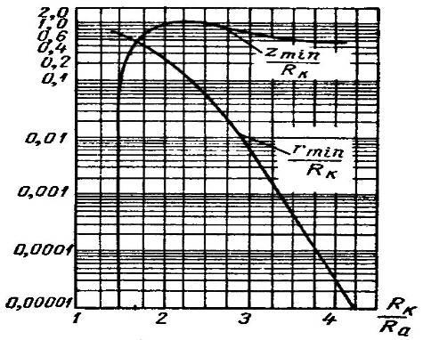 Зависимости угла от угла для различных отношений радиусов кривизны анода и катода приведены на рис.6. После выхода луча через анодную диафрагму в рабочую камеру, где электрического поля нет, он под влиянием объемного заряда начинает расходиться, хотя его минимальное сечение и находится в пространстве за анодом. Величина радиуса минимального сечения пучка и расстояние этого сечения от плоскости анодной диафрагмы зависят от радиуса пучка при прохождении анодной диафрагмы , первеанса и угла сходимости . Для электронных пушек с величины и являются функциями только отношения . Графики, позволяющие определить эти параметры, приведены на рис.7.