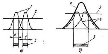 Рассмотрим, как "хвосты" рассеяния от экспонированных областей складываются и приводят к проявлению областей, в которые не проходило прямое экспонирование электронным пучком, но которые получили суммарную дозу, достаточную для их проявления. При малом рассеянии (тонкий слой электро-норезиста — Рисунок 3, а) область проявления соответствует области экспонирования, поэтому можно получить изображение малых экспонируемых областей dпри их близком взаимном расположении. Сильное рассеяние электронов (Рисунок 3, б) искажает не только размеры проявленных областей, но и вызывает взаимное влияние близко расположенных элементов изображения. Такое влияние называют эффектом близости.