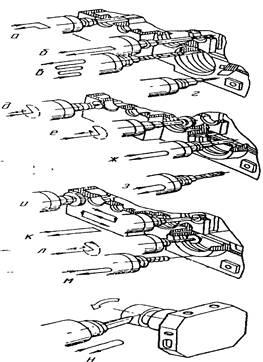 Механизм подачи. Заготовка, устанавливаемая на столе станка, при обработке перемещается в горизонтальной плоскости в двух взаимно перпендикулярных направлениях - продольном и поперечном. Шпиндель станка вместе с ползуном может перемещаться по вертикали. Эти три движения осуществляются от трех исполнительных механизмов станка. Каждый исполнительный механизм (М\, М2, Mj) снабжен шаговым двигателем, который управляет гидродвигателем (fy, Г3, Г4), а последний, в свою очередь, приводит в движение рабочий орган станка через зубчатые колеса и шариковую винтовую пару (2,3,4). Каждому импульсу, поступающему в шаговый двигатель, соответствует перемещение ползуна со шпинделем или стола на 0,01 мм. Скорость подачи изменяется от 20 до 600 мм/мин. Консоль станка со столом и салазками имеет установочное вертикальное перемещение от гидромотора Г] через пару конических колес 18-72 и винтовую пару 1. В станке предусмотрено и ручное перемещение узлов.