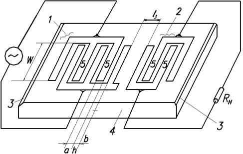 Существует много методов возбуждения поверхностных волн. Рассмотрим метод, основанный на использовании в преобразователе встречных штырей (ВШП - встречно штыревые преобразователи). Он удачно сочетается с технологическими методами микроэлектроники. Схематично такой преобразователь показан на рис.1, где 1 - входной преобразователь; 2 - выходной преобразователь; 3 - поглотитель; 4 - звукопровод; 5 - штыри (напыленные металлические электроды).