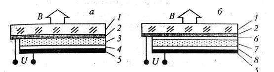 В конструкції рис.27,г є три прозорих світловипромінюючих елементи з червоним, зеленим або синім випромінюванням, накладені один на інший з незалежним керуванням.
