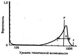 Для каждого параметра технических возможностей имеется по одному такому распределению. Система, у которой отсутствует постепенная "деградация", на таком графике будет представлена двумя точками. Система более общего вида характеризуется подобной кривой, и именно это распределение описывает жизнеспособность системы.