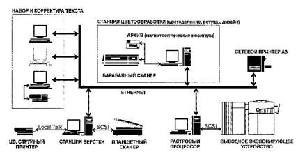 Аппаратное решение станции верстки должно быть ориентировано на платформу графической станции. Необходимое количество станций набора, графических станций и станций верстки объединяют в общую сеть. К этой сети подключаются периферийные устройства: черно-белые и цветные принтеры, устройства цветопробы, лазерные экспонирующие выводные устройства.