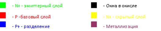 Эти противоречивые требования приводят к следующему компромиссу: сопротивление эпитаксиальной пленки выбирается таким, чтобы оно обеспечивало заданное высоковольтное напряжение самого высоковольтного транзистора с учетом способа его изготовления. Это приводит к выбору значения удельного сопротивления из диапазона ρк = 0,15…5 Ом∙см. Но при всех реальных параметрах транзисторов такие значения удельного сопротивления приводят к завышенному значению сопротивления тела коллектора. Во избежании этого вводят высоколегированный n+-слой. Т.к. напряжение коллектор – база транзисторов составляет Uкб = 12 В, то есть в несколько раз меньше пробивного напряжения перехода коллектор – база, следовательно не необходимости в применении дополнительных мерах защиты от пробоя.