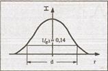 и т.д. Лазерный пучок имеет в этом случае в каждом месте профиль интенсивности по типу гауссовой колоколообразной кривой. Чтобы при таком распределении интенсивности можно было говорить о диаметре пучка, в качестве диаметра определяют значение, при котором интенсивность лазерного излучения снизилась в е2