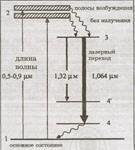 находятся на основном уровне. Вследствие поглощения света ламп накачки они возбуждаются в состояние полос возбуждения 2. Вследствие быстрых безизлучтельных переходов населяется верхний метастабильный (долгоживущий) лазерный уровень 3. Таким образом, возникает инверсия населенности на переходе 3-4, дающая возможность лазерной генерации на длине волны 10064 мкм в ближней ИК области спектра.