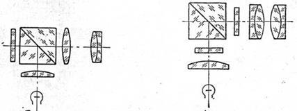 Окуляр с призмой-куб и двумя сетками(рис.4) получил широкое распространение в контрольно-юстировочных приборах. Поскольку призма-куб находится до первого фокуса окуляра, можно применять и короткофокусные окуляры. Все поле зрения для наблюдений свободно, сетки обычно различные: на одной индекс (крест, штрих и т. п.)