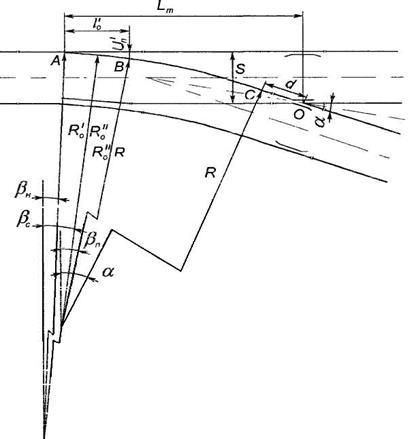 Кут вигину контррейки на цій ділянці визначається за допустимою величиною характеристики втрати кінетичної енергії при ударі колеса у відвід контррейки W