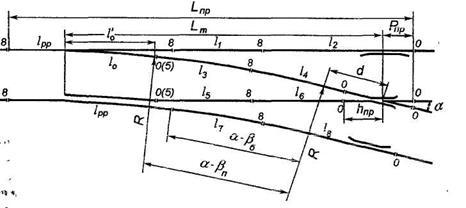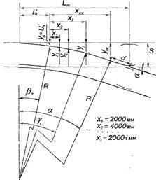за напрямком зовнішньої рейкової нитки прямої колії (рис. 8.2). Ці відрізки визначають, користуючись відомими значеннями лінійних розмірів переводу, гостряків і довжин рейкових рубок.