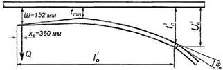 Розрахункова схема роботи гостряків при їх переводі залежить від конструкції гостряка, його довжини і типу кореневого кріплення. Для гнучкого гостряка зі звичайним накладочним кореневим кріпленням розрахункова схема являє собою балку, затиснену в корені і завантажену силами в місцях приєднання перевідних тяг і рівномірно розподіленим навантаженням, що дорівнює силам тертя гостряка по подушках. На рис.3 приведена розрахункова схема гнучкого гостряка з однією перевідною тягою. Припустивши, що перетин гостряка на всій довжині незмінний і при переводі гостряків один з них згинається, а інший розгинається, одержимо вираз для визначення зусилля, необхідного для переводу пари гостряків: