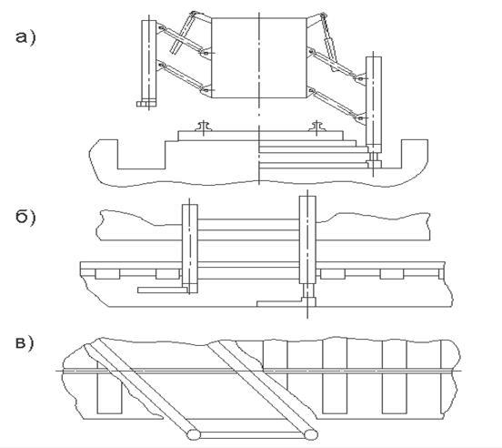 Для подведения ножа под поднятую рельсошпальную решетку канаты лебедок, установленные на щебнеочистительном устройстве, закрепляются за проушины. После подведения на конические бобышки стоек несущей рамы направляют гнезда 7 подрезного ножа и притягивают его цепями канатов лебедок к стойкам несущей рамы. В этом положении нож удерживается при работе машины. К скобам ножа прикрепляют при помощи крюков 5 прутки – струнки, которые поддерживают оторвавшиеся шпалы и предотвращают попадание их под отвал планировщика. В случае, когда щебнеочистительные машины используют в качестве электробалластера для подъемки пути, вместо ножа устанавливают балластировочные рамы со струнками. Их также, как нож, прикрепляют к коническим выступам несущей рамы.