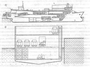 Эти проблемы возникают вследствие большой интенсивности производства грузовых операций и в ряде случаев небрежного отношения докеров к перегружаемой технике. Характерной особенностью грузовых помещений автомобилевозов является наличие большого числа грузовых палуб, общее число которых может достигать 10-13. Как указывалось ранее первоначально высота просветов между стационарными палубами выбиралась исходя из размеров перевозимой автотехники, в основном легковых автомобилей, и составляла 1,65-1.8 м. По мере расширения номенклатуры перевозимой автотехники конструкция грузовых помещений автомобилевозов совершенствовалась за счет увеличения межпалубного пространства между стационарными палубами до 6,5 м и установки между ними подвижных палуб-платформ. Такая конструкция позволяет иметь широкий выбор межпалубных пространств: 6200; 4600; 4000; 3300; 2450; 2400; 2200; 1650 мм (рис.10.20). Автомобилевозы обычно имеют две аппарели: кормовую и бортовую, а в грузовых помещениях все палубы связаны между собой пандусами, подъемными рампами и лифт-подъемниками (рис.1 и 2).