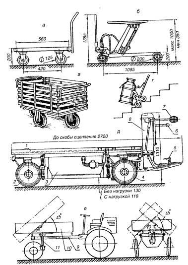 а - четырехколесная ручная; б - ручная с подъемным столом, в - универсальная с кузовом; г - планетарными колесами для переезда препятствий; д - электротележка; е - с опрокидывающимся кузовом на самоходном шасси; 1 - платформа; 2 - ведущее колесо; 3 - аккумуляторные батареи; 4 - рулевое колесо; 5 - педаль; 6 и 7 - рукоятки управления; 8 - контроллер и механизмы управления; 9 - шасси: 10 - кузов; 11 - гидроцилиндр