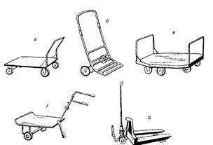 Грузовые тележки (рис. 1, 2) - самое простое и распространенное средство малой механизации для горизонтального перемещения грузов. Тележки выпускаются с ручным и механическим приводом, грузоподъемностью от 50 до 3200 кг. Их обозначения следующие: ТГ - тележка грузовая для тарно-штучных грузов, ТГМ - тележка грузовая модернизированная, ТГВ - с подъемными вилами, ТГШ - для перевозки бочек и затаренных грузов. Цифры указывают грузоподъемность.