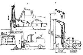 а - схема подъемного механизма автопогрузчика; б - схема электропогрузчика с механизмом поперечного перемещения груза; в - схема навески стрелы с крюком