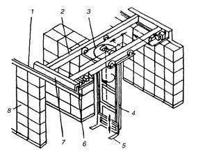 1 - подкрановые пути; 2 - главные балки моста; 3 - тележка; 4 - несущая вертикальная колонна; 5 - вилочный захват; 6 - привод; 7 - концевые балки; 8 - стеллажи или колонны
